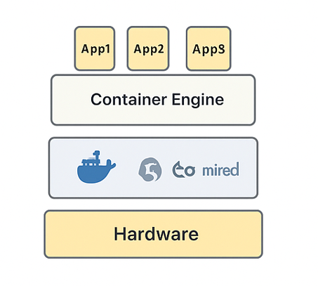 • Container Runtime Layer: Above the OS sits the runtime — tools such as Docker, Podman, or containerd. These manage how containers are created, started, and connected to the system.